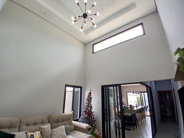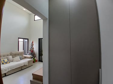 ✨ Sala com pé-direito alto e porta central icônica que integra ou divide ambientes