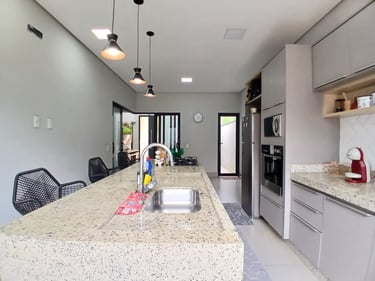 ✨ Cozinha planejada 9x2,5m com bancada em mármore, cooktop, forno, micro-ondas e mesa industrial